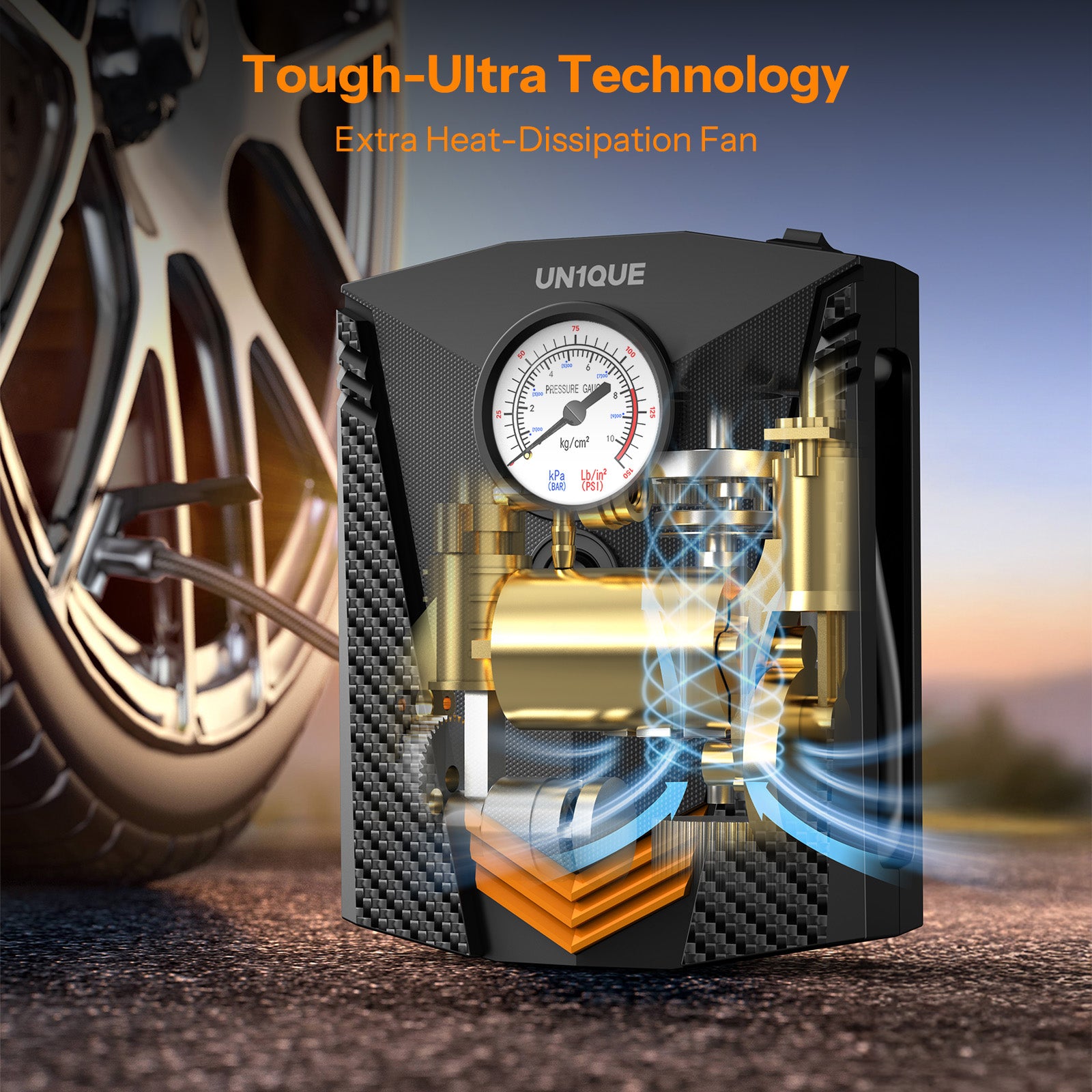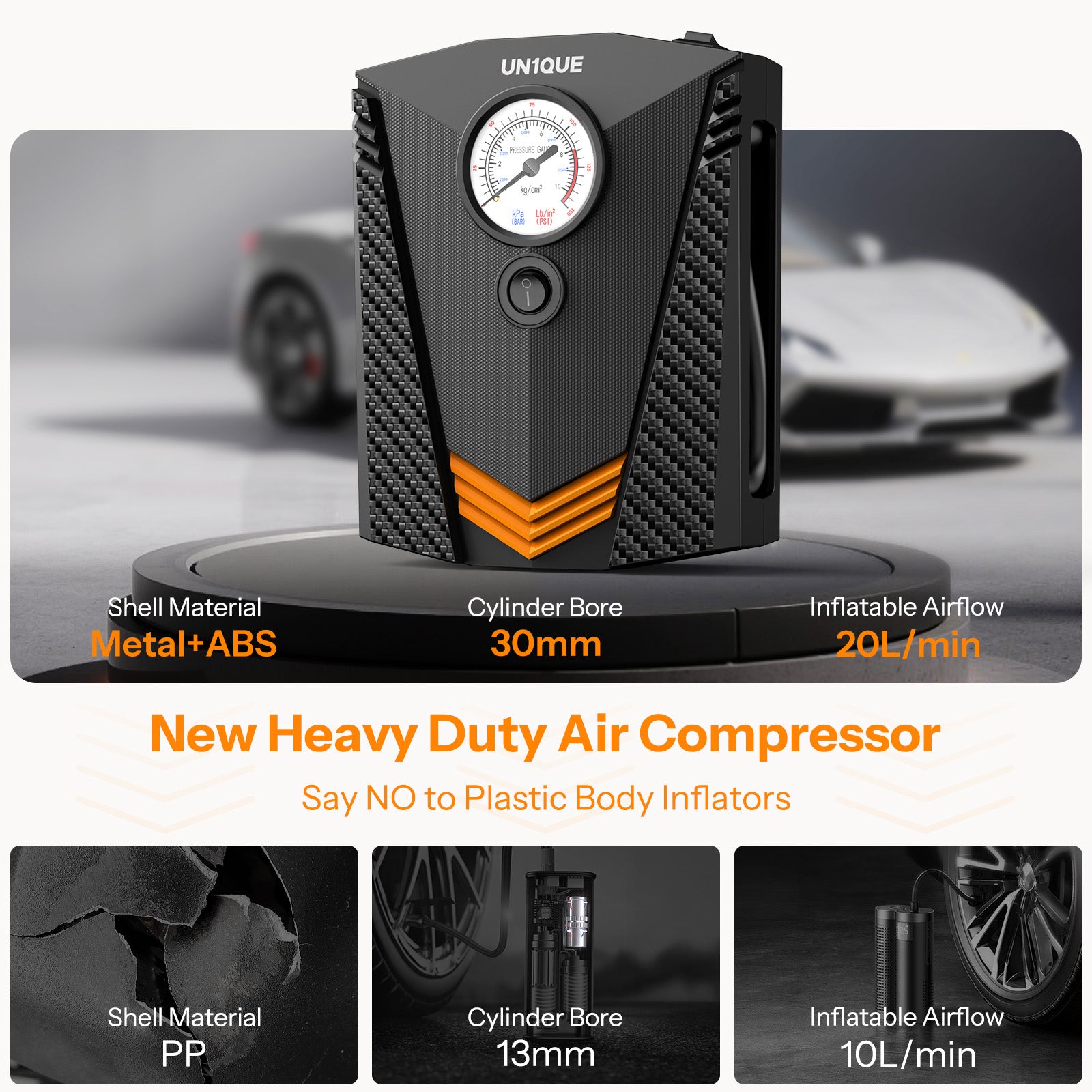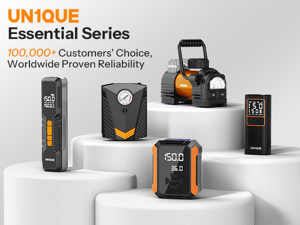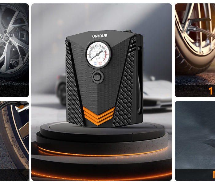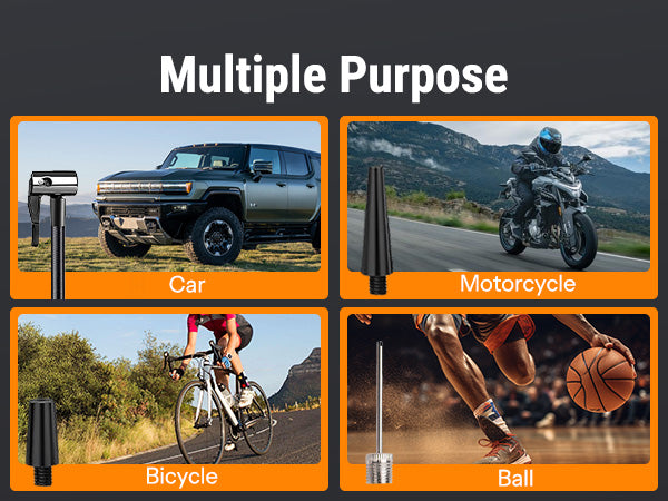 Un1que PT300 car air compressor pump has a 9.8ft power cord and inflatable adaptors( 3 additional nozzles) allowing to reach all tires of your car, bike, motor, ATV, compact or midsize Sedan, SUV, air mattress, inflatable boats, balls and other inflatables (NOTE: NOT SUITABLE FOR TRUCKS OR MOTOR LORRIES).