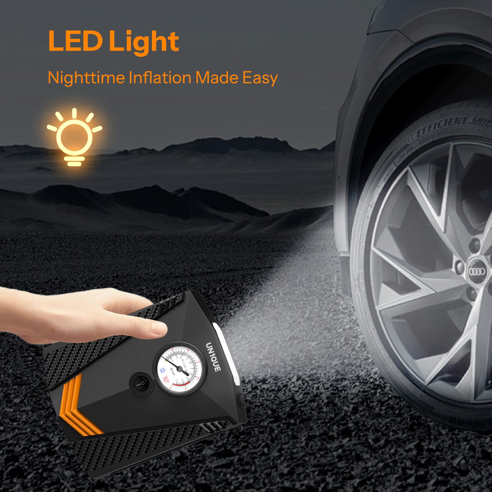 Unique PT300 tire inflator is equipped with a long-lasting LED lights that can be easily used even in the dark.
